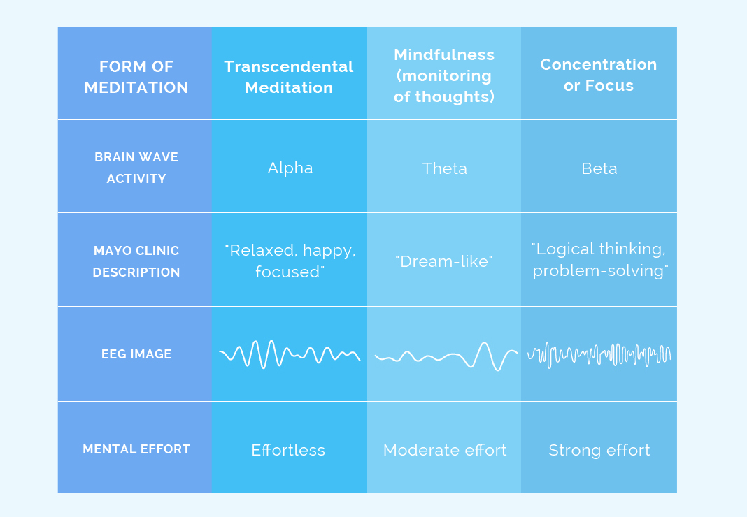 A major research study at American University found that TM creates alpha brain waves. The Mayo Clinic describes alpha brain waves as being associated with a "relaxed, happy, focused" state of mind.